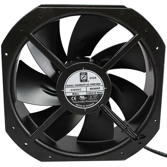 This is manufactured by Orion Fans. The manufacturer part number is OA280AP-22-1WB1868. The blades are constructed from robust steel materials. It is assigned with possible HTSUS value of 8414.59.6590. The product is rohs3 compliant. Furthermore, the product is 89.00mm wide. The product features power and watts of 210w. It has a 1300.0 cfm (36.40m³/min) air flow rate. It is approved by ce, curus, tuv, ur. It has noise values of 73.0db. It also exhibits voltage rating of 230vac. In addition, it is reach unaffected. This has integrated with a ball, a bearing with long-lasting features. The product has -22 ~ 176°f (-30 ~ 80°c) operating temperature range. It provides maximum rpm up to 3200 rpm. This product offers longer life span for 50000 hrs @ 55°c. The product has a 0.750 in h2o (186.8 pa) static pressure. It is shipped in box. The product's diameters include square - 280mm l x 280mm h. The product features 2 wire leads termination style. It has a long 19 weeks standard lead time. Its typical moisture sensitivity level is not applicable. It is IP rated with ip68 - dust tight, waterproof. The splendid features of the product include capacitor, thermal overload protector (top). The typical product's weight is 7.4 lbs (3.4 kg). The product oa280ap, is a highly preferred choice for users. The frame of the product is made from highly durable aluminum materials. The latest designed fan is a type of tubeaxial offering unmatchable applications. Moreover, it corresponds to oa280ap, a base product number of the product. The product is designated with the ear99 code number