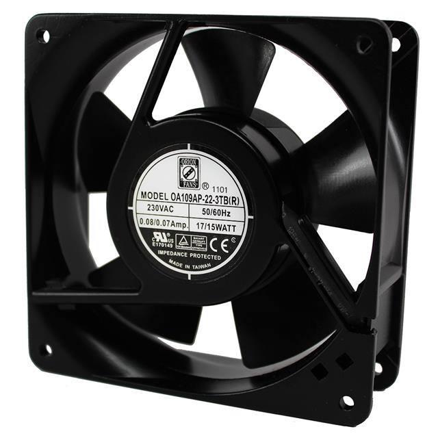 This is manufactured by Orion Fans. The manufacturer part number is OA109AP-22-3TBR. The blades are constructed from robust polybutylene terephthalate (pbt) materials. It is assigned with possible HTSUS value of 8414.59.6590. Furthermore, the product is 38.50mm wide. The product features power and watts of 12.00w. It has a 75.0 cfm (2.10m³/min) air flow rate. It is approved by curus, tuv. While the voltage range is 160 ~ 260vac. It has noise values of 38.0db(a). It also exhibits voltage rating of 230vac. This has integrated with a ball, a bearing with long-lasting features. The product has -4 ~ 176°f (-20 ~ 80°c) operating temperature range. It provides maximum rpm up to 2300 rpm. This product offers longer life span for 60000 hrs @ 40°c. The product has a 0.160 in h2o (39.8 pa) static pressure. It is shipped in bulk. The product's diameters include square - 119.5mm l x 119.5mm h. The product features 2 terminals termination style. It has a long 1 weeks standard lead time. Its typical moisture sensitivity level is not applicable. The product oa109ap, is a highly preferred choice for users. The frame of the product is made from highly durable aluminum materials. The latest designed fan is a type of tubeaxial offering unmatchable applications. The product is designated with the ear99 code number