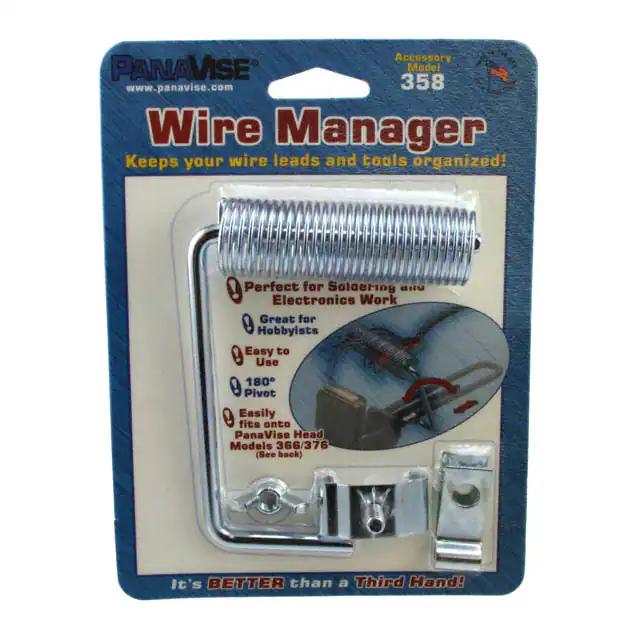 This is manufactured by Panavise. The manufacturer part number is 358. It is assigned with possible HTSUS value of 8205.70.0090. It is shipped in bulk. The product is not applicable. It is a type of wire manager accessory. Its typical moisture sensitivity level is not applicable. The product is suitable for use with 366, 367. It has a long 2 weeks standard lead time. The product is designated with the ear99 code number
