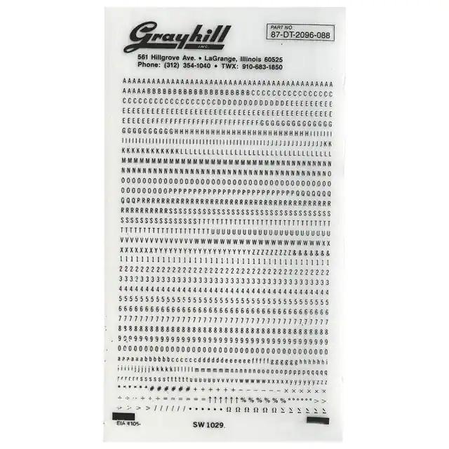 This is manufactured by Grayhill Inc.. The manufacturer part number is 87-DT-2096-088. It is assigned with possible HTSUS value of 8538.90.8160. The product is rohs compliant. It is a type of legend sheet accessory. In addition, it is reach unaffected. Its typical moisture sensitivity level is 1 (unlimited). The product is suitable for use with multiple series. The product is designated with the ear99 code number