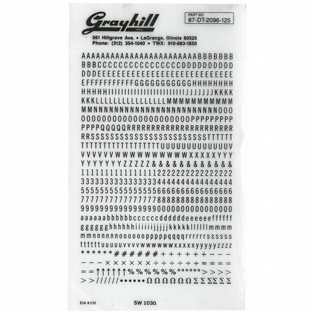 This is manufactured by Grayhill Inc.. The manufacturer part number is 87-DT-2096-125. It is assigned with possible HTSUS value of 8538.90.8160. The product is rohs compliant. It is a type of legend sheet accessory. In addition, it is reach unaffected. Its typical moisture sensitivity level is 1 (unlimited). The product is suitable for use with multiple series. The product is designated with the ear99 code number