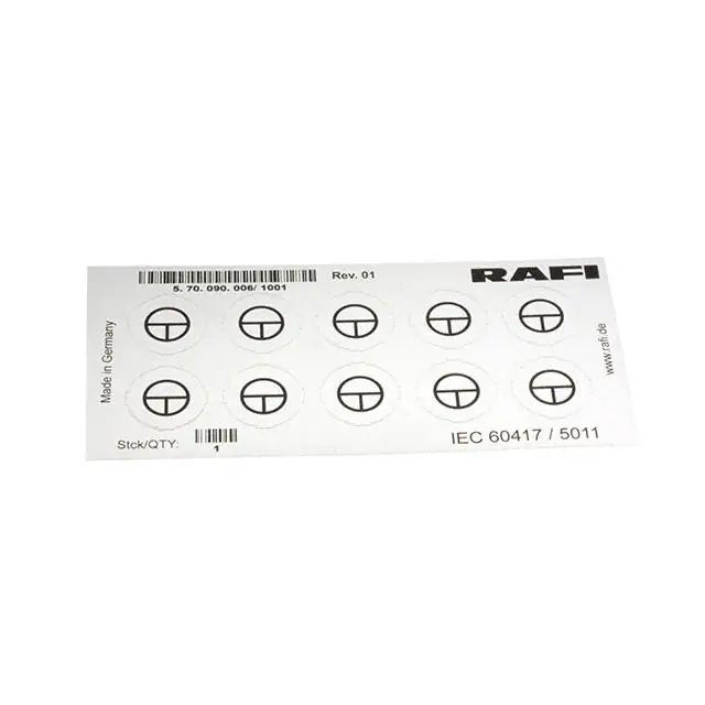This is manufactured by RAFI USA. The manufacturer part number is 5.70090.0061001. The product is suitable for use with rafix 22 fs and 30 fs series. It is assigned with possible HTSUS value of 8538.90.8180. It is shipped in bulk. The product is rohs3 compliant. It is a type of legend sheet accessory. Its typical moisture sensitivity level is 1 (unlimited). Moreover, it corresponds to 5.70090, a base product number of the product. It has a long 4 weeks standard lead time. The product is designated with the ear99 code number