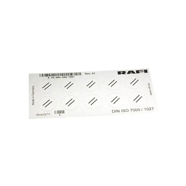 This is manufactured by RAFI USA. The manufacturer part number is 5.70090.0201001. The product is suitable for use with rafix 22 fs and 30 fs series. It is assigned with possible HTSUS value of 8538.90.8180. It is shipped in bulk. The product is rohs3 compliant. It is a type of legend sheet accessory. Its typical moisture sensitivity level is 1 (unlimited). Moreover, it corresponds to 5.70090, a base product number of the product. It has a long 4 weeks standard lead time. The product is designated with the ear99 code number