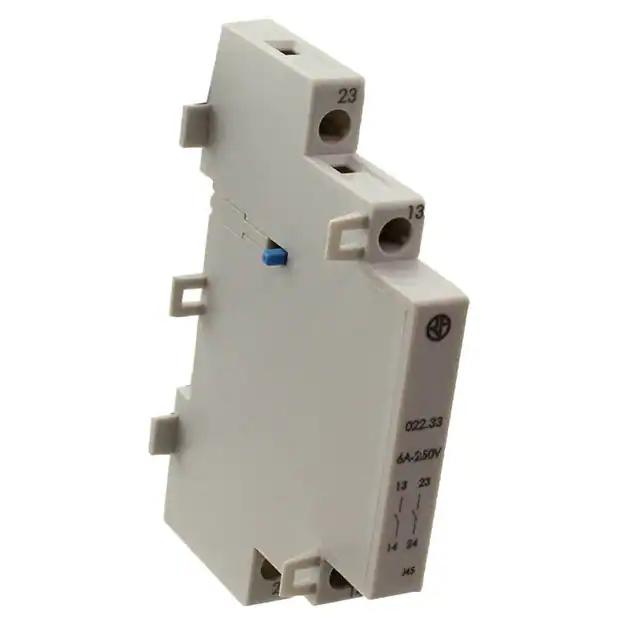 This is manufactured by Finder Relays, Inc.. The manufacturer part number is 022.33. It is assigned with possible HTSUS value of 8536.90.8585. It is shipped in box. The product 22, is a highly preferred choice for users. The product is rohs3 compliant. It is a type of auxiliary contact block accessory. In addition, it is reach unaffected. Its typical moisture sensitivity level is not applicable. The product is suitable for use with 22 series. It has a long 6 weeks standard lead time. The product is designated with the ear99 code number