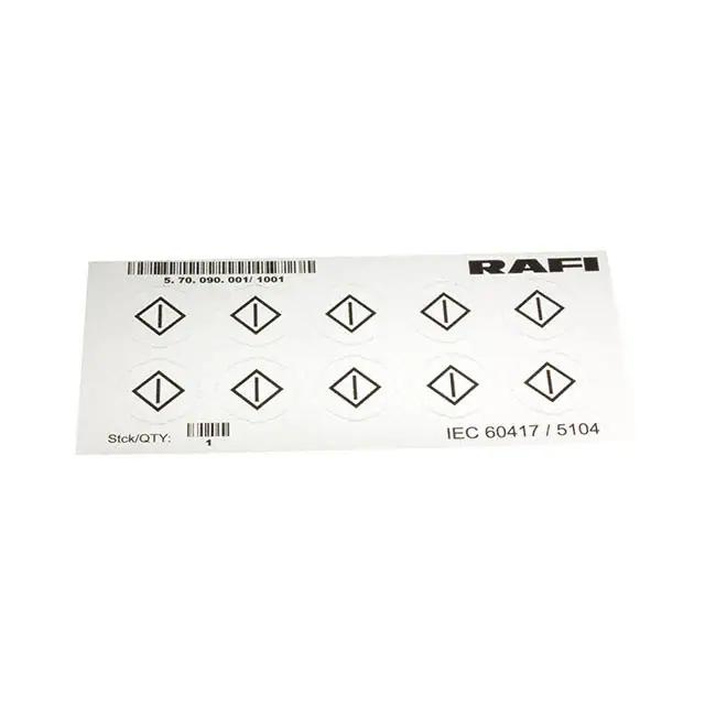 This is manufactured by RAFI USA. The manufacturer part number is 5.70.090.001/1001. It is assigned with possible HTSUS value of 8538.90.8180. It is shipped in bulk. The product is rohs3 compliant. It is a type of legend sheet accessory. In addition, it is reach unaffected. Its typical moisture sensitivity level is not applicable. Moreover, it corresponds to 5.70090, a base product number of the product. It has a long 4 weeks standard lead time. The product is suitable for use with rafix 22 fs and 30 fs series. The product is designated with the ear99 code number