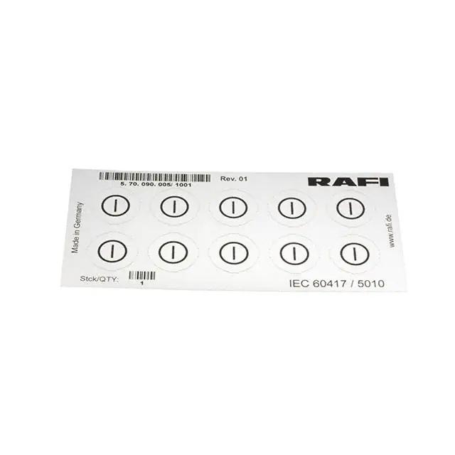 This is manufactured by RAFI USA. The manufacturer part number is 5.70.090.005/1001. It is assigned with possible HTSUS value of 8538.90.8180. It is shipped in bulk. The product is rohs3 compliant. It is a type of legend sheet accessory. In addition, it is reach unaffected. Its typical moisture sensitivity level is not applicable. Moreover, it corresponds to 5.70090, a base product number of the product. It has a long 4 weeks standard lead time. The product is suitable for use with rafix 22 fs and 30 fs series. The product is designated with the ear99 code number