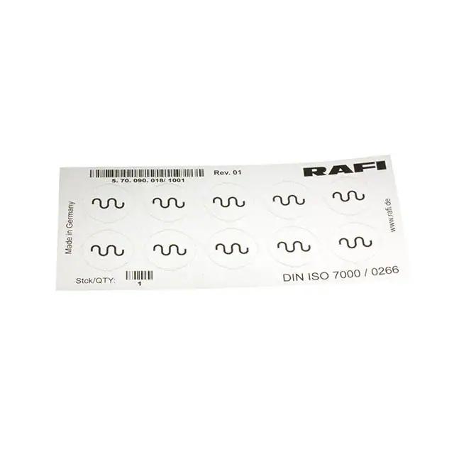 This is manufactured by RAFI USA. The manufacturer part number is 5.70.090.018/1001. It is assigned with possible HTSUS value of 8538.90.8180. It is shipped in bulk. The product is rohs3 compliant. It is a type of legend sheet accessory. In addition, it is reach unaffected. Its typical moisture sensitivity level is not applicable. Moreover, it corresponds to 5.70090, a base product number of the product. It has a long 4 weeks standard lead time. The product is suitable for use with rafix 22 fs and 30 fs series. The product is designated with the ear99 code number
