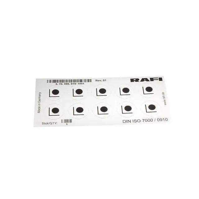 This is manufactured by RAFI USA. The manufacturer part number is 5.70.090.019/1001. It is assigned with possible HTSUS value of 8538.90.8180. It is shipped in bulk. The product is rohs3 compliant. It is a type of legend sheet accessory. In addition, it is reach unaffected. Its typical moisture sensitivity level is not applicable. Moreover, it corresponds to 5.70090, a base product number of the product. It has a long 4 weeks standard lead time. The product is suitable for use with rafix 22 fs and 30 fs series. The product is designated with the ear99 code number