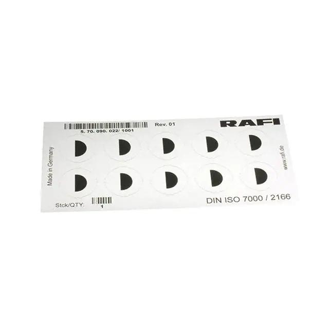 This is manufactured by RAFI USA. The manufacturer part number is 5.70.090.022/1001. It is assigned with possible HTSUS value of 8538.90.8180. It is shipped in bulk. The product is rohs3 compliant. It is a type of legend sheet accessory. In addition, it is reach unaffected. Its typical moisture sensitivity level is not applicable. Moreover, it corresponds to 5.70090, a base product number of the product. It has a long 4 weeks standard lead time. The product is suitable for use with rafix 22 fs and 30 fs series. The product is designated with the ear99 code number