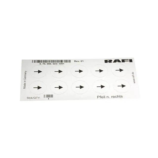 This is manufactured by RAFI USA. The manufacturer part number is 5.70.090.023/1001. It is assigned with possible HTSUS value of 8538.90.8180. It is shipped in bulk. The product is rohs3 compliant. It is a type of legend sheet accessory. In addition, it is reach unaffected. Its typical moisture sensitivity level is not applicable. Moreover, it corresponds to 5.70090, a base product number of the product. It has a long 4 weeks standard lead time. The product is suitable for use with rafix 22 fs and 30 fs series. The product is designated with the ear99 code number