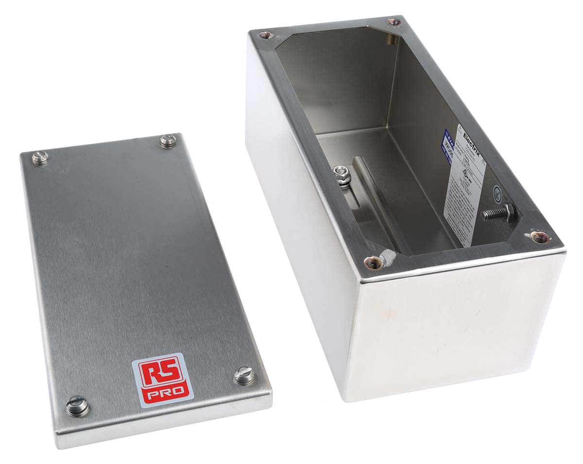 This is 304 Stainless Steel Satin Adaptable Enclosure Box 0 Knockouts 100 mm x 85mm manufactured by RS Pro. The manufacturer part number is 121-9695. A quality product with a nice satin finish. The product is made from highly stable and reliable 304 stainless steel. Its accurate length is 220mm. In addition, the height is 220mm. Furthermore, the product is 100mm wide. The product comes in 85mm depth.