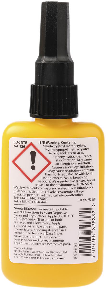 This is 326 50 ml Liquid Acrylic Adhesive manufactured by Loctite. The manufacturer part number is 232688. It has a maximum operating temperature of +120°c.