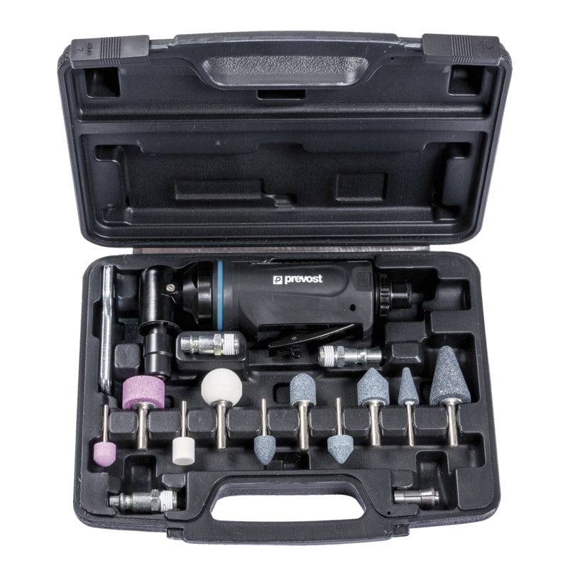 This is Angle 90° mini grinder in complet kit manufactured by PREVOST. The manufacturer part number is TDG A18000K. It has a robust speed of 18000rpm.