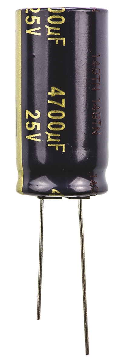 This is Aluminium Electrolytic Capacitor 4700μF 25V dc 18mm FC Radial Series Through Hole Electrolytic ±20% manufactured by Panasonic. The manufacturer part number is EEUFC1E472. Its diameter is 18mm. The given dimensions of the product include 18 (dia.) x 35.5mm. The product is available in radial, through hole configuration. The product fc, is a highly preferred choice for users. In addition, the height is 35.5mm. It provides a 4700µf of capacitance value. It carries a 25v dc of voltage. It has a maximum operating temperature of +105°c. It features ±20% of tolerance value. Whereas, the minimum operating temperature of the product is -55°c. This product use aluminium electrolytic technology.