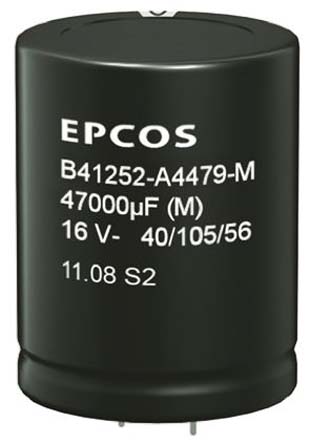 This is Aluminium Electrolytic Capacitor 47000μF 16V dc 35mm Push In Solder B41252 Series Through Hole Electrolytic manufactured by EPCOS. The manufacturer part number is B41252A4479M000. Its diameter is 35mm. The given dimensions of the product include 35 (dia.) x 45mm. The product is available in snap-in configuration. The product b41252, is a highly preferred choice for users. In addition, the height is 45mm. It provides a 47000µf of capacitance value. It carries a 16v dc of voltage. It has a maximum operating temperature of +105°c. It features ±20% of tolerance value. Whereas, the minimum operating temperature of the product is -40°c. This product use aluminium electrolytic technology.