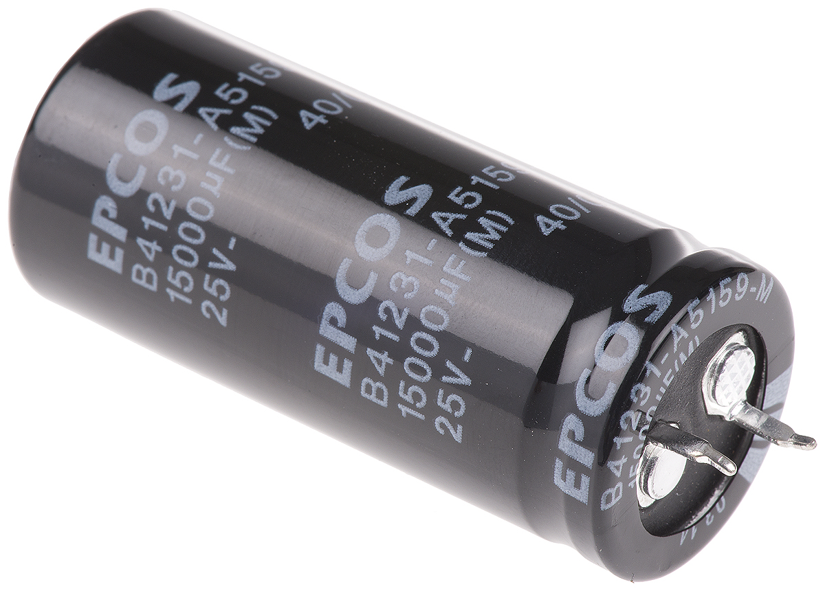 This is Aluminium Electrolytic Capacitor 15000μF 25V dc 22mm Through Hole B41231 Series Through Hole Electrolytic ±20% manufactured by EPCOS. The manufacturer part number is B41231A5159M000. Its diameter is 22mm. The given dimensions of the product include 22 (dia.) x 50mm. The product is available in snap-in configuration. The product b41231, is a highly preferred choice for users. In addition, the height is 50mm. It provides a 15000µf of capacitance value. It carries a 25v dc of voltage. It has a maximum operating temperature of +85°c. It features ±20% of tolerance value. Whereas, the minimum operating temperature of the product is -40°c. This product use aluminium electrolytic technology.