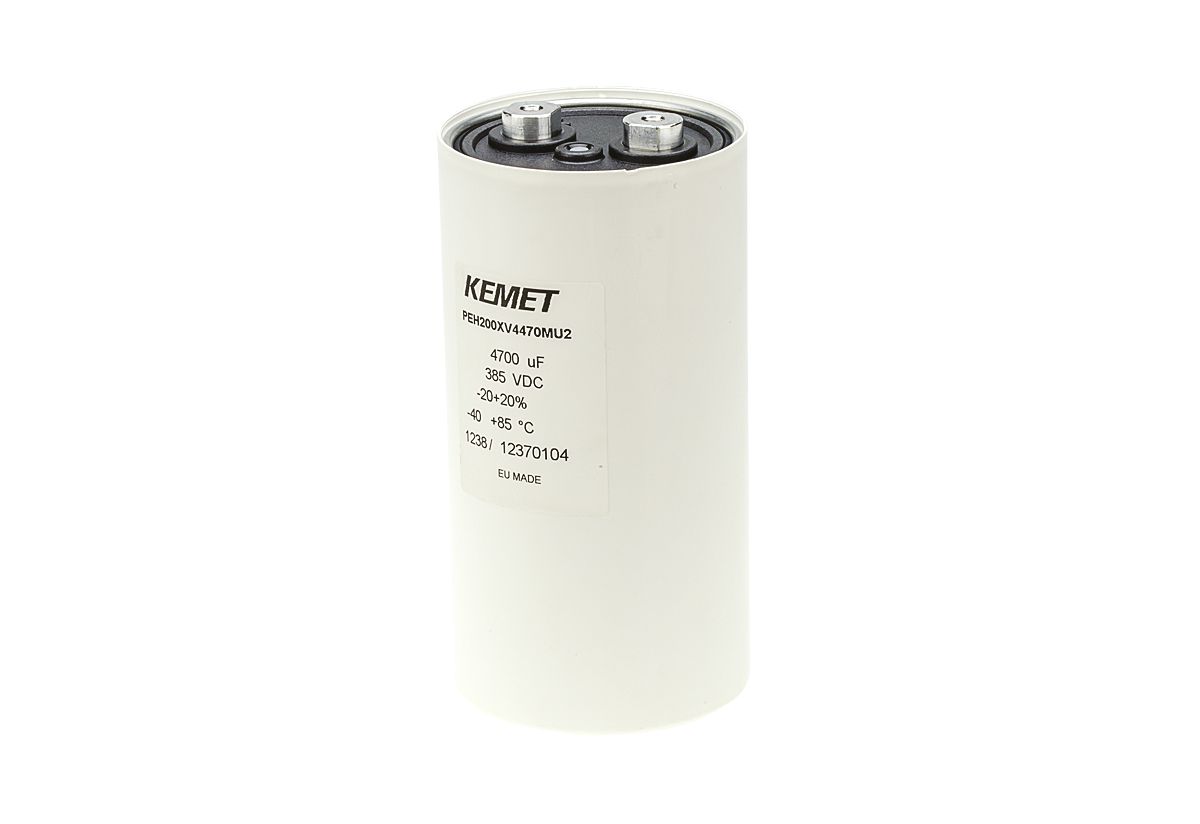 This is Aluminium Electrolytic Capacitor 4700μF 385V dc 76.6mm Can - Screw Terminals Radial PEH200 Series manufactured by KEMET. The manufacturer part number is PEH200XV4470MU2. Its diameter is 76.6mm. The given dimensions of the product include 76.6 x 149.2mm. The product is available in screw terminal configuration. The product peh200, is a highly preferred choice for users. In addition, the height is 149.2mm. It provides a 4700µf of capacitance value. Its accurate length is 149.2mm. It carries a 385v dc of voltage. It has a maximum operating temperature of +85°c. It features ±20% of tolerance value. Whereas, the minimum operating temperature of the product is -40°c. This product use aluminium electrolytic technology. It is shipped in box. In addition, it is reach unaffected. It has a long 18 weeks standard lead time.
