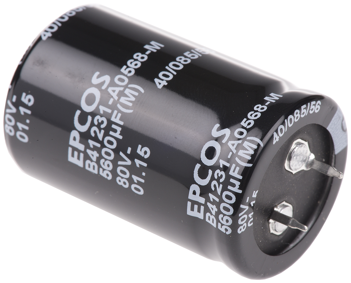 This is Aluminium Electrolytic Capacitor 5600μF 80V dc 30mm B41231 Series Through Hole Electrolytic ±20% manufactured by EPCOS. The manufacturer part number is B41231A0568M000. Its diameter is 30mm. The given dimensions of the product include 30 (dia.) x 45mm. The product is available in snap-in configuration. The product b41231, is a highly preferred choice for users. In addition, the height is 45mm. It provides a 5600µf of capacitance value. It carries a 80v dc of voltage. It has a maximum operating temperature of +85°c. It features ±20% of tolerance value. Whereas, the minimum operating temperature of the product is -40°c. This product use aluminium electrolytic technology.