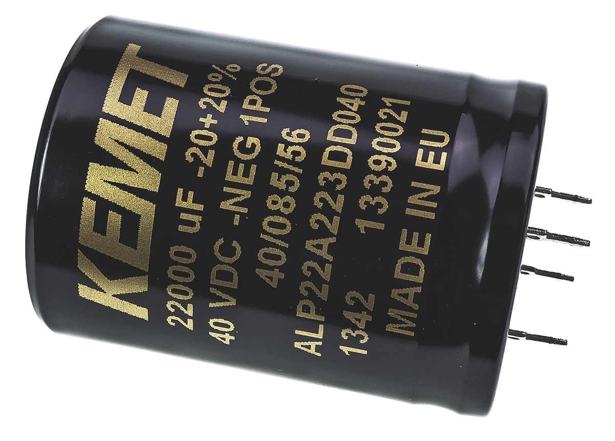 This is manufactured by KEMET. The manufacturer part number is ALP22A223DD040. Its diameter is 40mm. The given dimensions of the product include 40 x 55mm. The product is available in pcb mount configuration. The product alp22, is a highly preferred choice for users. It provides a 22000µf of capacitance value. Its accurate length is 55mm. It carries a 40v dc of voltage. It has a maximum operating temperature of +85°c. It features -10 → +30% of tolerance value. Whereas, the minimum operating temperature of the product is -40°c. This product use aluminium electrolytic technology. It is assigned with possible HTSUS value of 8532.22.0055. The product is rohs3 compliant. The product features a [Ploarization] polarity. It provides a 22000 µf of capacitance value. The product has -40°c ~ 85°c operating temperature range. Moreover, the product comes in [Package/ Case]. It features ±20% of tolerance value. It also exhibits voltage rating of 40 v. It has the maximum seated height of 2.244" (57.00mm) In addition, it is reach unaffected. The product is widely employed in general purpose. It is shipped in bulk. The product's diameters include 1.575" dia (40.00mm). It has a long 36 weeks standard lead time. Its typical moisture sensitivity level is not applicable. The product is available in through hole configuration. This product offers longer life span for 26000 hrs @ 85°c. It is assigned with 0.394" (10.00mm) of lead spacing. Moreover, it corresponds to alp22a, a base product number of the product. The product is designated with the ear99 code number