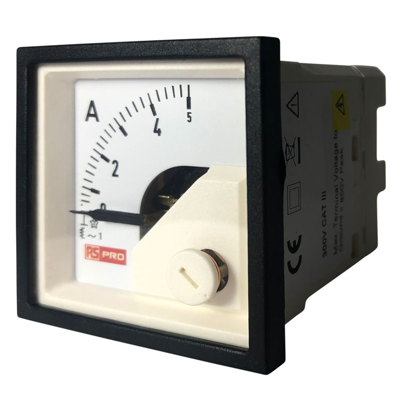 This is Analogue Panel Ammeter 5 (Input Scale)A AC 48mm x 48mm 1 % Moving Iron manufactured by RS PRO. The manufacturer part number is 186-2412. The product comes in 54 (<30 a)mm depth.