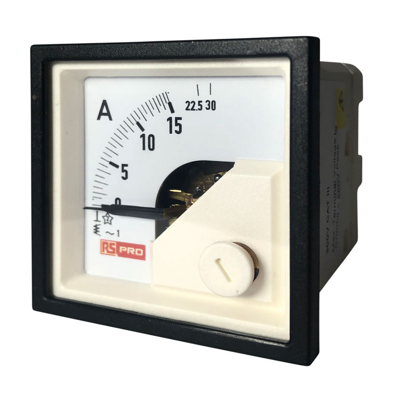 This is Analogue Panel Ammeter 30 (Input)A AC 48mm x 48mm 1 % Moving Iron manufactured by RS PRO. The manufacturer part number is 186-2423. The product comes in 54 (<30 a) mm, 72 (30 → 60 a) mm depth.