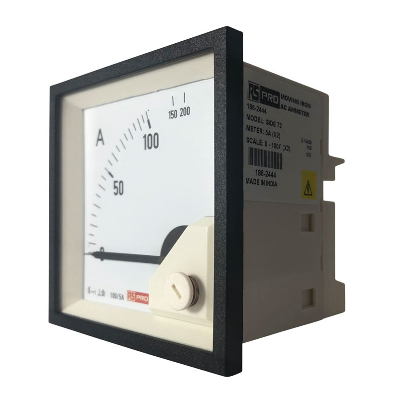 This is Analogue Panel Ammeter 10 (Input) A 100/5 (CT) A 200 (Scle) A AC 72mm x 72mm 1 % Moving Iron manufactured by RS PRO. The manufacturer part number is 186-2444. The product comes in 54 (<30 a) mm, 62 (30 → 60 a) mm, 66 (100 a) mm depth.