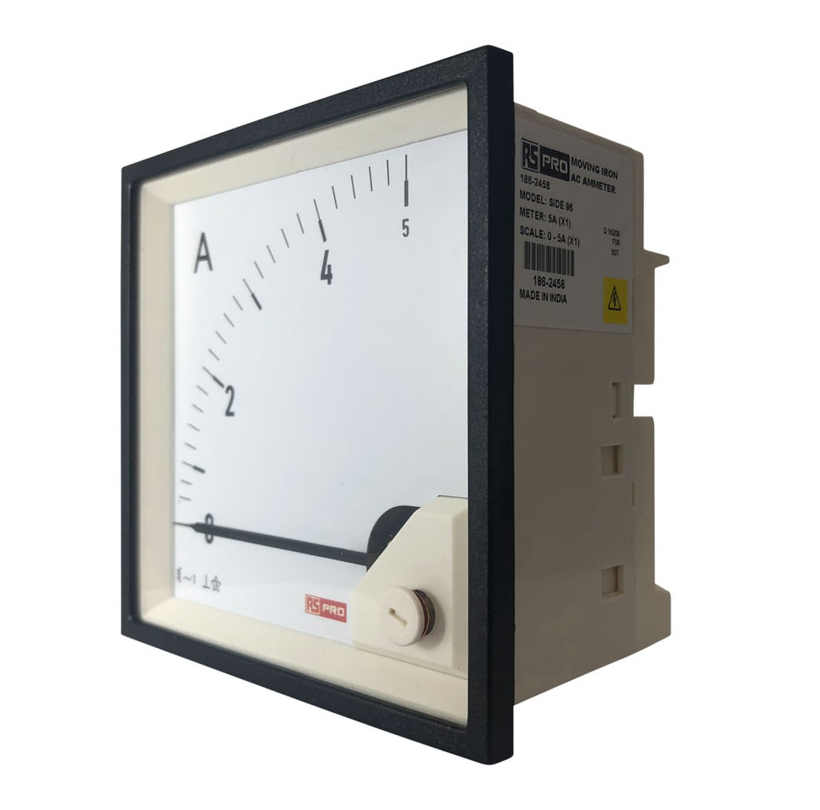 This is Analogue Panel Ammeter 5 (Input Scale)A AC 96mm x 96mm 1 % Moving Iron manufactured by RS PRO. The manufacturer part number is 186-2458. The product comes in 54 (<30 a)mm depth.