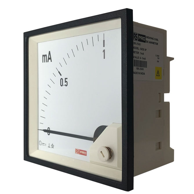 This is Analogue Panel Ammeter 1 (Input)mA DC 96mm x 96mm 1 % Moving Coil manufactured by RS PRO. The manufacturer part number is 186-2500. The product comes in 54 (<4 a)mm depth.