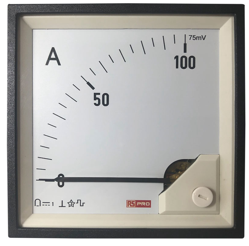 This is Analogue Panel Ammeter DC 96mm x 96mm 1 % Moving Coil manufactured by RS PRO. The manufacturer part number is 186-2505. The product comes in 54 (<4 a) mm, 67 (5 → 60 a) mm, 67 (60 → 100 a) mm depth.