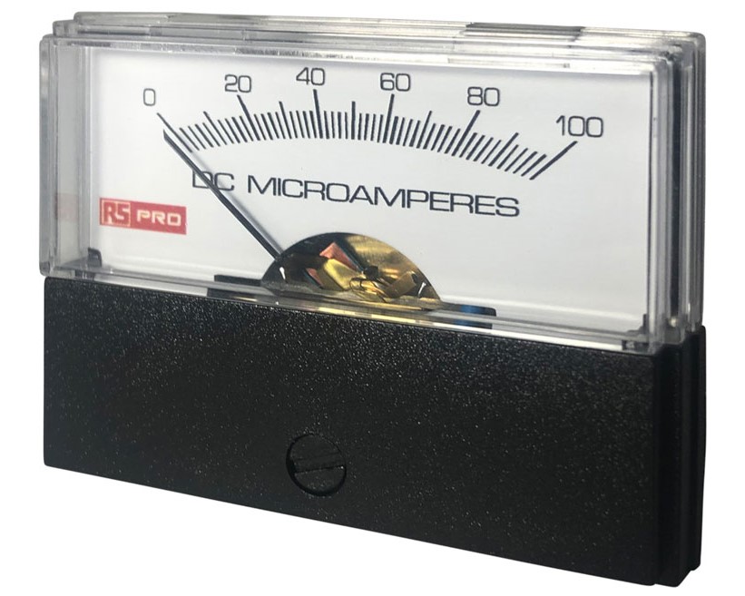 This is Analogue Panel Ammeter 100 (Input)μA DC 57mm x 44mm 1.5 % Moving Coil manufactured by RS PRO. The manufacturer part number is 186-2536. The product comes in 45.7mm depth.