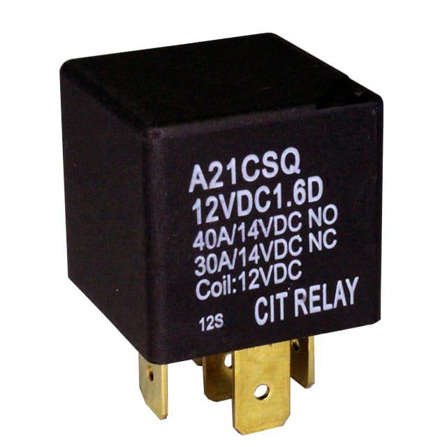 This is manufactured by CIT Relay and Switch. The manufacturer part number is A21CSQ12VDC1.6D. It is assigned with possible HTSUS value of 8536.41.0050. The product is rohs compliant. The coil voltage of the product is 12vdc. Moreover, it has plug in, quick connect - 0.250" (6.3mm) terminal style. The product has -40°c ~ 125°c operating temperature range. It holds up to 90 ohms coil resistance. It has a coil current of 133.3 ma. The coil is a non latching type. The product's switching voltage is 75vdc - max. Robust coil power of 1.6w. In addition, it is reach unaffected. On the other hand, 8.4 vdc is the given crucial/must operating voltage. It is shipped in tray. It also has a spdt (1 form c) contact form. Its typical moisture sensitivity level is 1 (unlimited). The operating time of the product is 7 ms. While the must release voltage is a 1.2 vdc. It has a long 18 weeks standard lead time. It has a contact current rating of 40 a. The splendid features of the product include diode, sealed - fully. The product is available in socketable configuration. The product a2, is a highly preferred choice for users. While 5 ms is its release time. The product is designated with the ear99 code number Moreover, it corresponds to a21csq, a base product number of the product. The product is made from sturdy silver tin oxide (agsno) materials.