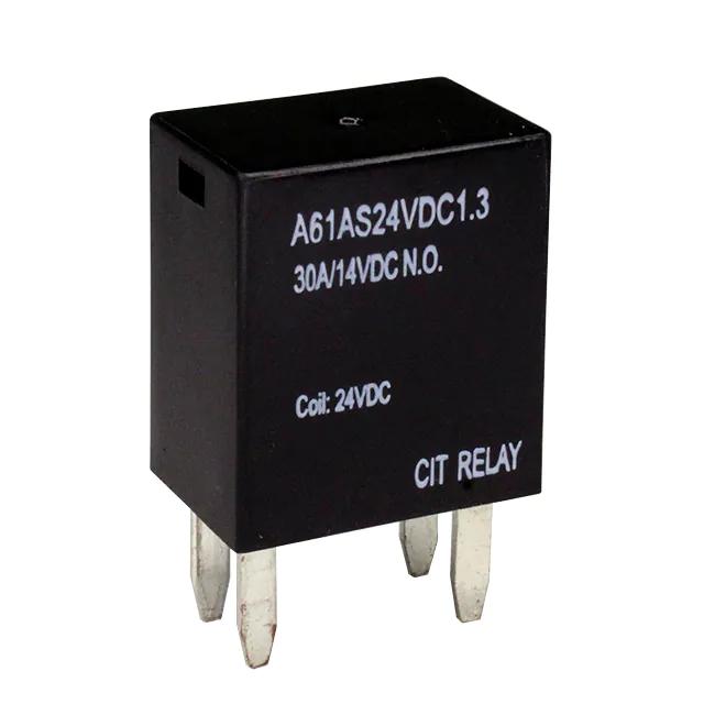 This is manufactured by CIT Relay and Switch. The manufacturer part number is A61AS24VDC1.3D. It is assigned with possible HTSUS value of 8536.41.0050. The product is rohs compliant. The coil voltage of the product is 24vdc. Moreover, it has pc pin terminal style. The product has -40°c ~ 85°c operating temperature range. It holds up to 436 ohms coil resistance. It has a coil current of 55 ma. The coil is a non latching type. The product's switching voltage is 75vdc - max. Robust coil power of 1.3w. In addition, it is reach unaffected. On the other hand, 16.8 vdc is the given crucial/must operating voltage. It is shipped in tray. It also has a spst-no (1 form a) contact form. Its typical moisture sensitivity level is 1 (unlimited). The operating time of the product is 5 ms. While the must release voltage is a 2.4 vdc. It has a long 19 weeks standard lead time. It has a contact current rating of 30 a. The splendid features of the product include diode, sealed - fully. The product is available in through hole configuration. The product a6, is a highly preferred choice for users. While 2 ms is its release time. The product is designated with the ear99 code number Moreover, it corresponds to a61as, a base product number of the product. The product is made from sturdy silver tin oxide (agsno) materials.