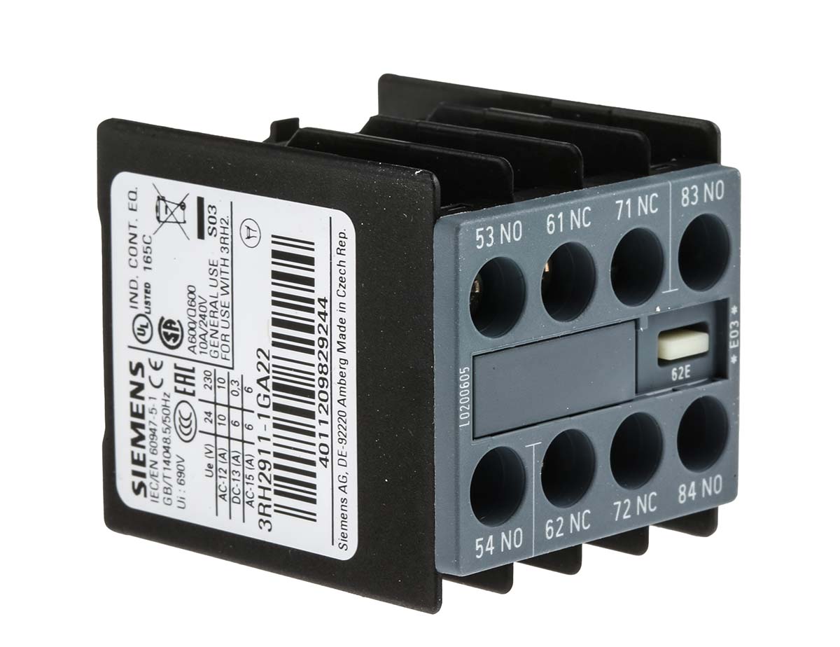 This is Snap Front Auxiliary Contact with Screw Terminal 2NO/2NC 10 A 600 V dc 690 V ac manufactured by Siemens. The manufacturer part number is 3RH2911-1GA22. Whereas, the minimum operating temperature of the product is -25°c. The product 3rh2, is a highly preferred choice for users. The product contains 4 contacts. It has a maximum operating temperature of +60°c. The terminal is a screw type.
