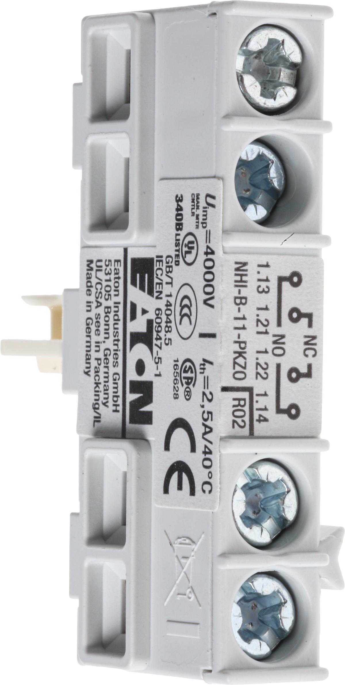 This is Auxiliary Contact - 1NC + 1NO 2 Contact Front Mount 1 A ac 2 A dc manufactured by Eaton. The manufacturer part number is 208277 NHI-B-11-PKZ0. Whereas, the minimum operating temperature of the product is -25°c. The product eaton moeller, is a highly preferred choice for users. The product contains 2 contacts. It has a maximum operating temperature of +55°c. The terminal is a screw type.