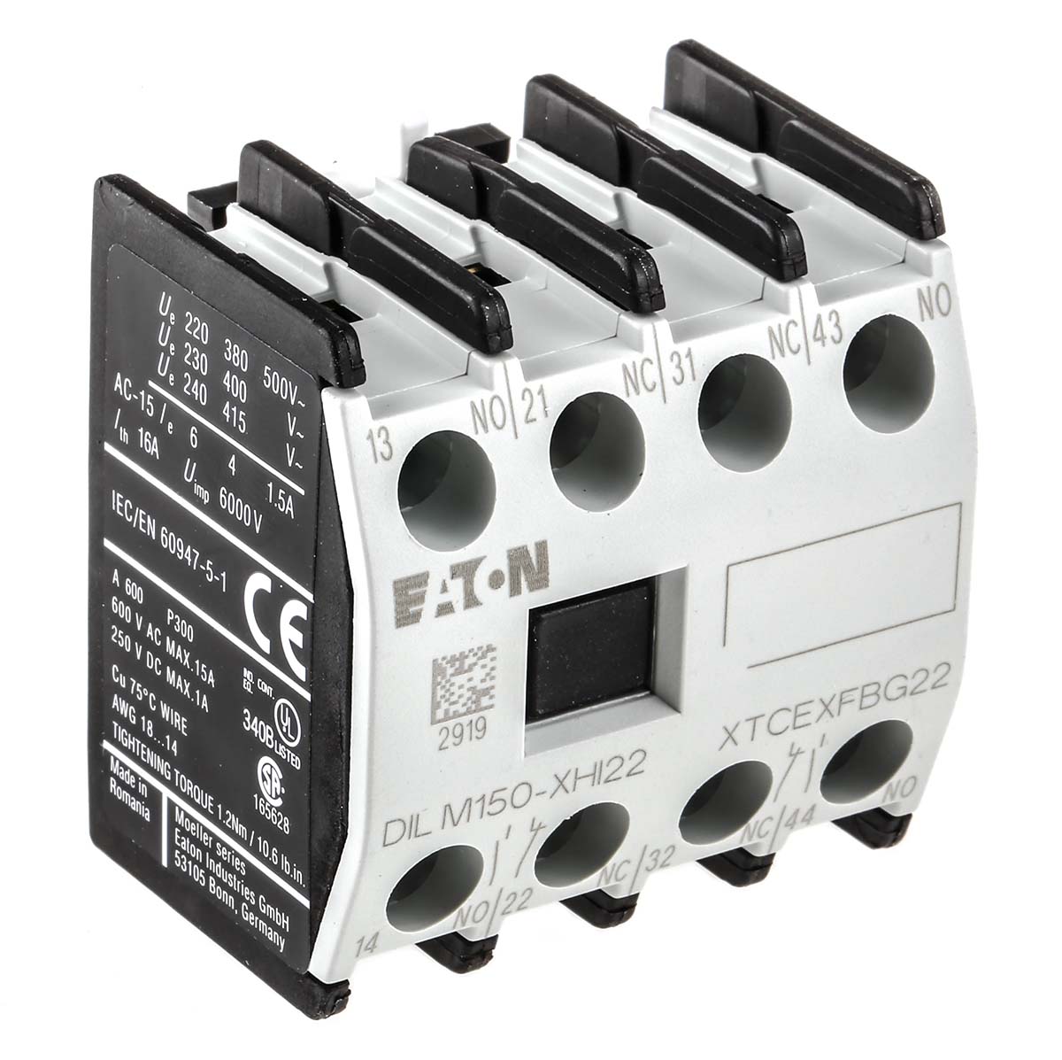 This is Auxiliary Contact - 2NC + 2NO 4 Contact Front Mount 4 A ac 10 A dc manufactured by Eaton. The manufacturer part number is 277950 DILM150-XHI22. The product eaton moeller, is a highly preferred choice for users. The product contains 4 contacts. The terminal is a screw type.