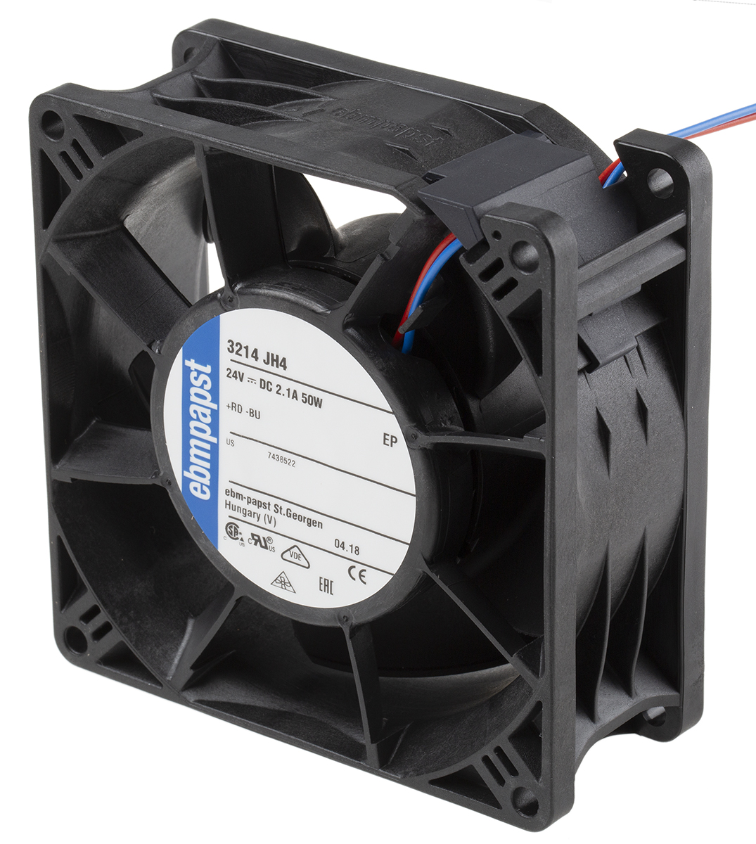 This is Axial Fan 92 x 92 x 38mm 280m³/h 50W 24 V dc (3200J Series) manufactured by ebm-papst. The manufacturer part number is 3214JH4. The given dimensions of the product include 92 x 92 x 38mm. This has integrated with a ball, a bearing with long-lasting features. In addition, the height is 92mm. Furthermore, the product is 92mm wide. The product comes in 38mm depth. It has a 280m³/h air flow rate.