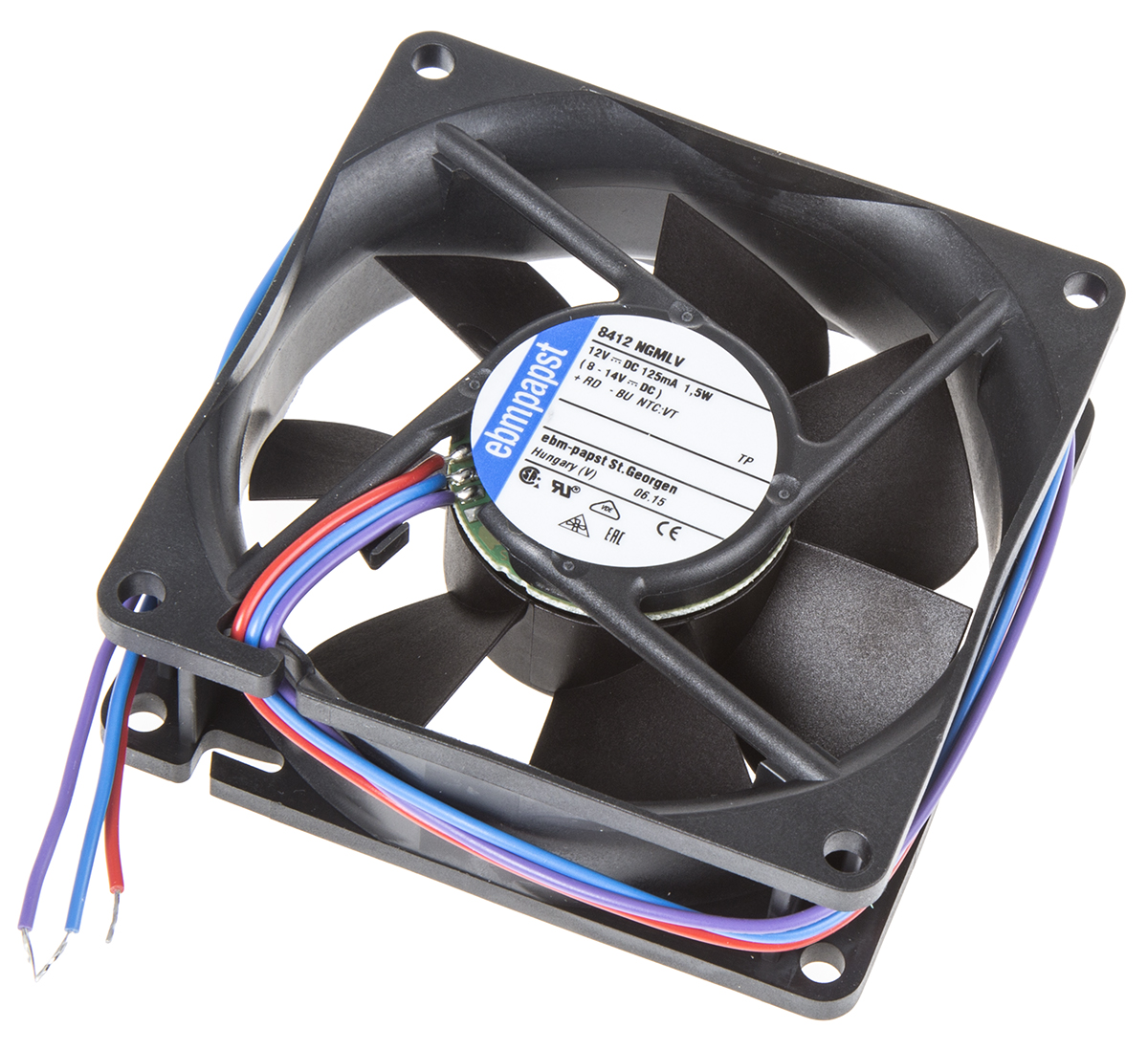 This is DC Axial Fan 80 x 80 x 25mm 45m³/h 1.5W 12 V dc (8400N Series) manufactured by ebm-papst. The manufacturer part number is 8412NGMLV. The given dimensions of the product include 80 x 80 x 25mm. This has integrated with a sleeve, a bearing with long-lasting features. In addition, the height is 80mm. Furthermore, the product is 80mm wide. The product comes in 25mm depth. It has a 45m³/h air flow rate. These sensors are sort of temperature.
