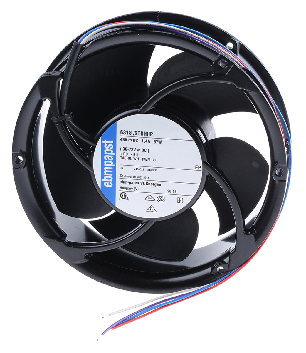 This is DC Axial Fan 172 (Dia.) x 51mm 710m³/h 67W 48 V dc (6300 Series) manufactured by ebm-papst. The manufacturer part number is 6318/2TDHHP. The given dimensions of the product include 172 x 51mm. This has integrated with a ball, a bearing with long-lasting features. The product comes in 51mm depth. It has a 600m³/h air flow rate. These sensors are sort of pwm, tachometer.