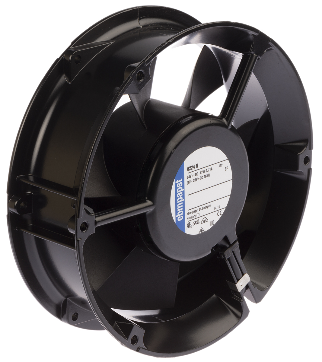This is Axial Fan 172 x 51mm 410m³/h 18W 24 V dc (6200N Series) manufactured by ebm-papst. The manufacturer part number is 6224N. The given dimensions of the product include 172 x 51mm. This has integrated with a ball, a bearing with long-lasting features. The product comes in 51mm depth. It has a 410m³/h air flow rate. These sensors are sort of temperature.