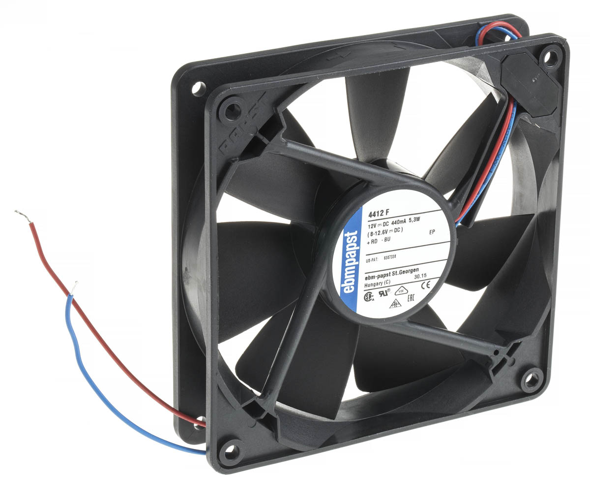This is Axial Fan 119 x 119 x 25mm 170m³/h 5.3W 12 V dc (4400F Series) manufactured by ebm-papst. The manufacturer part number is 4412F. The given dimensions of the product include 119 x 119 x 25mm. This has integrated with a ball, a bearing with long-lasting features. In addition, the height is 119mm. Furthermore, the product is 119mm wide. The product comes in 25mm depth. It has a 170m³/h air flow rate.