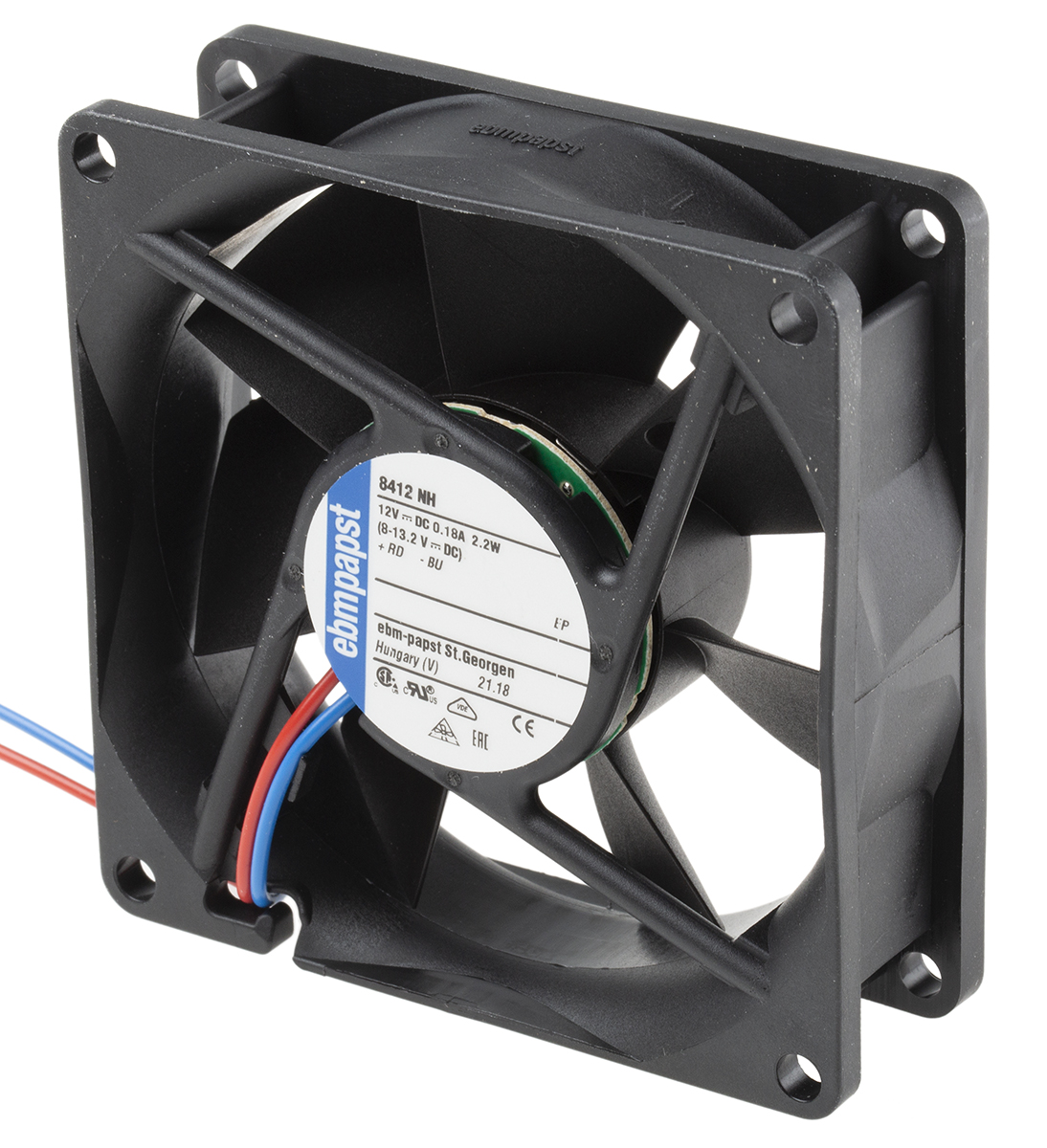 This is DC Axial Fan 80 x 80 x 25mm 79m³/h 2.2W 12 V dc (8400N Series) manufactured by ebm-papst. The manufacturer part number is 8412NH. The given dimensions of the product include 80 x 80 x 25mm. This has integrated with a ball, a bearing with long-lasting features. In addition, the height is 80mm. Furthermore, the product is 80mm wide. The product comes in 25mm depth. It has a 79m³/h air flow rate.