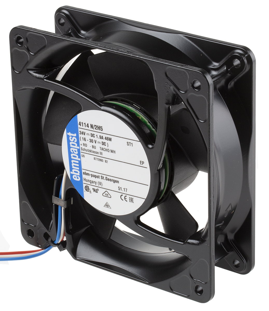 This is DC Axial Fan 119 x 119 x 38mm 390m³/h 45W 24 V dc (4100N Series) manufactured by ebm-papst. The manufacturer part number is 4114N/2H5. The given dimensions of the product include 119 x 119 x 38mm. This has integrated with a ball, a bearing with long-lasting features. In addition, the height is 119mm. Furthermore, the product is 119mm wide. The product comes in 38mm depth. It has a 390m³/h air flow rate. These sensors are sort of tachometer.