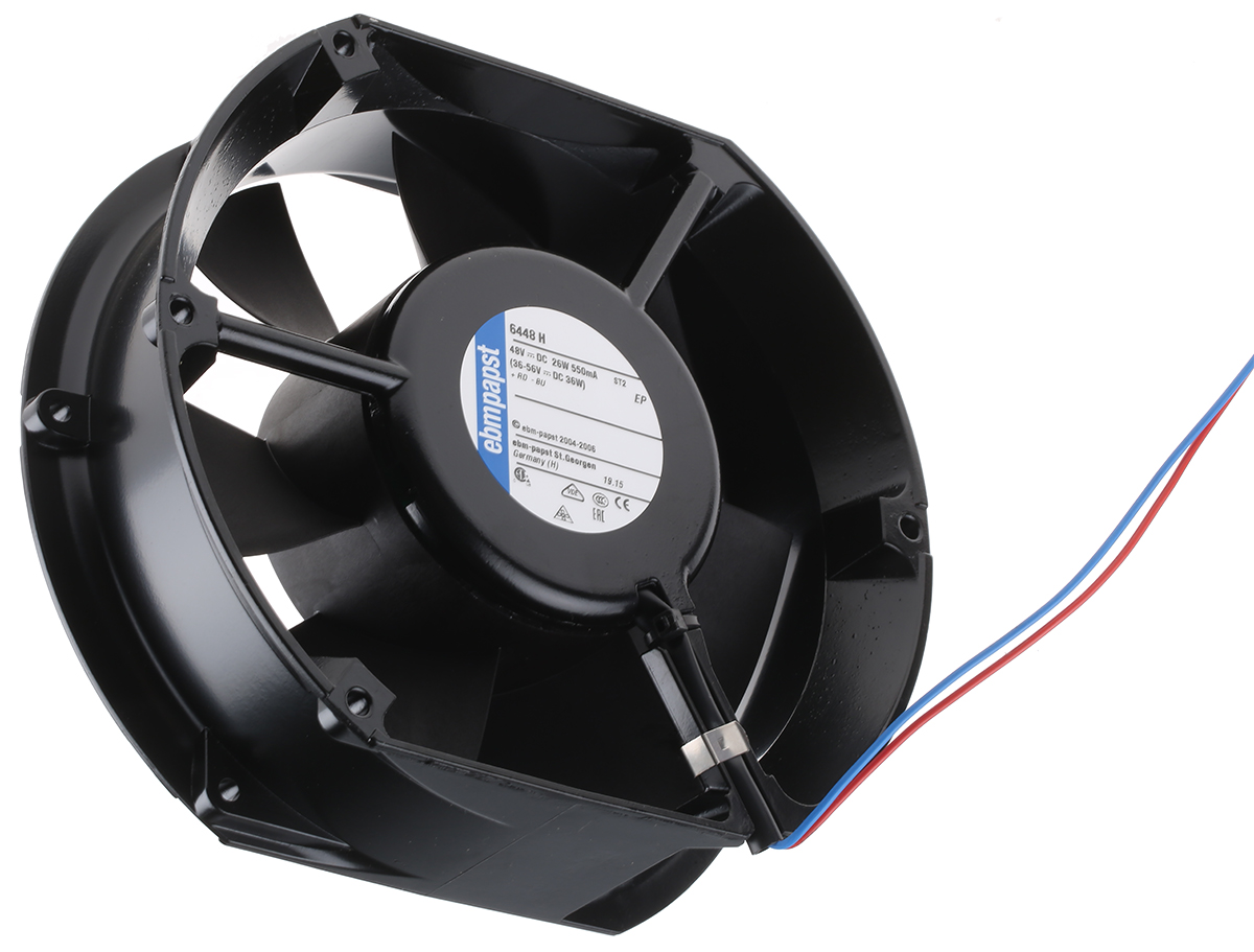 This is DC Axial Fan 150 x 172 x 51mm 480m³/h 26W 48 V dc (6400 Series) manufactured by ebm-papst. The manufacturer part number is 6448H. The given dimensions of the product include 172 x 150 x 51mm. This has integrated with a ball, a bearing with long-lasting features. In addition, the height is 150mm. Furthermore, the product is 172mm wide. The product comes in 51mm depth. It has a 480m³/h air flow rate.
