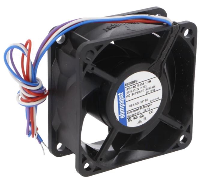 This is DC Axial Fan 60 x 60 x 25.4mm 44m³/h 1.5W 12 V dc (630 Series) manufactured by ebm-papst. The manufacturer part number is 632/2HPU. The given dimensions of the product include 60 x 60 x 25mm. This has integrated with a ball, a bearing with long-lasting features. In addition, the height is 60mm. Furthermore, the product is 60mm wide. The product comes in 25.4mm depth. It has a 44m³/h air flow rate. These sensors are sort of pwm, tachometer.