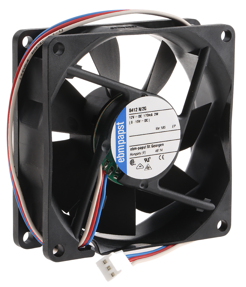 This is Axial Fan 80 x 80 x 25mm 65m³/h 500mW 12 V dc (8400N Series) manufactured by ebm-papst. The manufacturer part number is 8412N/2G-185. The given dimensions of the product include 80 x 80 x 25mm. This has integrated with a sleeve, a bearing with long-lasting features. In addition, the height is 80mm. Furthermore, the product is 80mm wide. The product comes in 25mm depth. It has a 69m³/h air flow rate. These sensors are sort of tachometer.