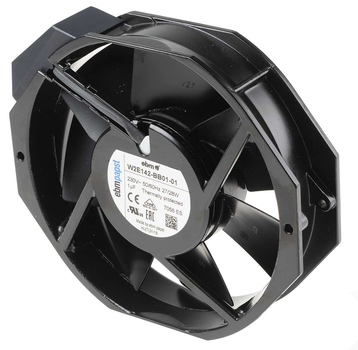 This is Axial Fan 150 x 172 x 38mm 391m³/h 25W 230 V ac (W2E142 Series) manufactured by ebm-papst. The manufacturer part number is W2E142-BB01-01. The given dimensions of the product include 172 x 150 x 38mm. This has integrated with a ball, a bearing with long-lasting features. In addition, the height is 150mm. Furthermore, the product is 172mm wide. The product comes in 38mm depth. It has a 330m³/h air flow rate.