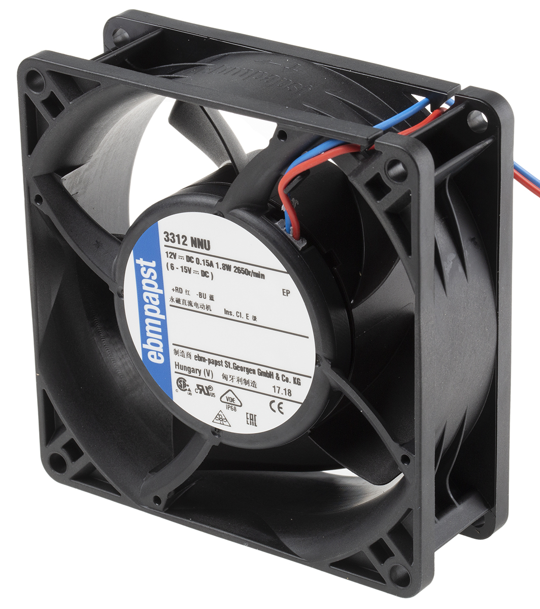 This is Axial Fan 92 x 92 x 32mm 80m³/h 1.8W 12 V dc (3300N Series) manufactured by ebm-papst. The manufacturer part number is 3312NNU. The given dimensions of the product include 92 x 92 x 32mm. This has integrated with a ball, a bearing with long-lasting features. In addition, the height is 92mm. Furthermore, the product is 92mm wide. The product comes in 32mm depth. It has a 80m³/h air flow rate.