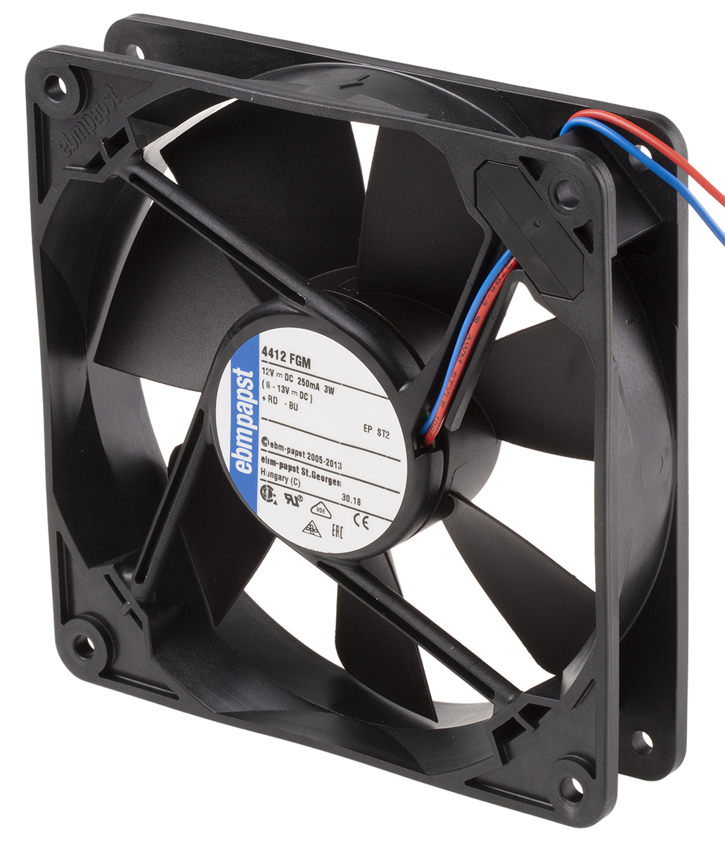 This is Axial Fan 119 x 119 x 25mm 140m³/h 3.2W 12 V dc (4400F Series) manufactured by ebm-papst. The manufacturer part number is 4412FGM. The given dimensions of the product include 119 x 119 x 25mm. This has integrated with a sleeve, a bearing with long-lasting features. In addition, the height is 119mm. Furthermore, the product is 119mm wide. The product comes in 25mm depth. It has a 140m³/h air flow rate.