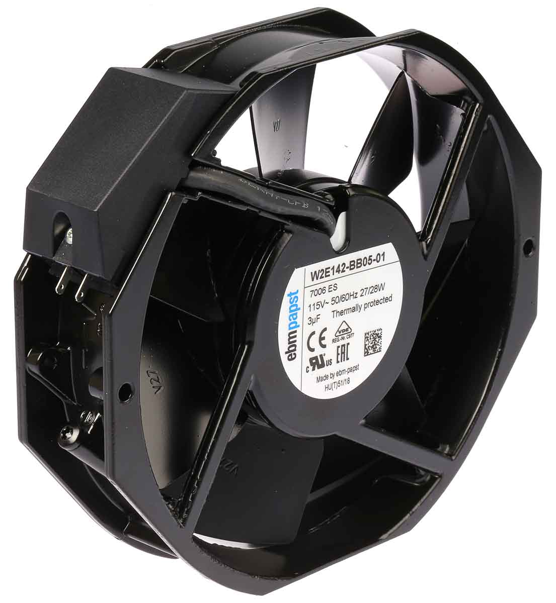 This is Axial Fan 150 x 172 x 38mm 391m³/h 24W 115 V ac (W2E142 Series) manufactured by ebm-papst. The manufacturer part number is W2E142-BB05-01. The given dimensions of the product include 172 x 150 x 38mm. This has integrated with a ball, a bearing with long-lasting features. In addition, the height is 150mm. Furthermore, the product is 172mm wide. The product comes in 38mm depth. It has a 330m³/h air flow rate.