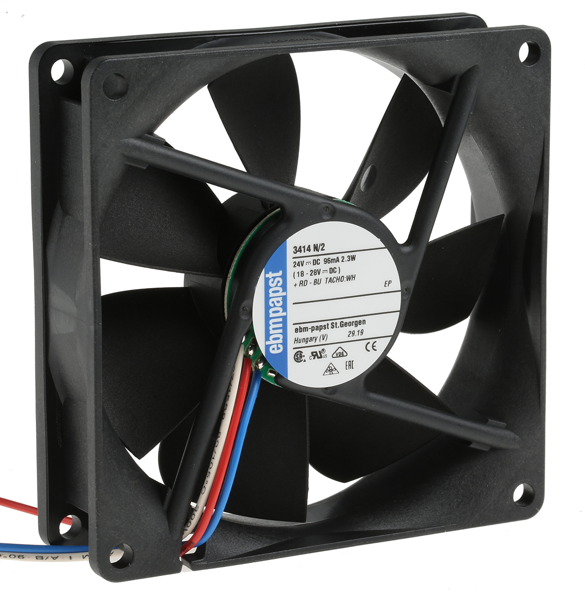 This is Axial Fan 92 x 92 x 25mm 84m³/h 2.3W 24 V dc (3400N Series) manufactured by ebm-papst. The manufacturer part number is 3414N/2. The given dimensions of the product include 92 x 92 x 25mm. This has integrated with a ball, a bearing with long-lasting features. In addition, the height is 92mm. Furthermore, the product is 92mm wide. The product comes in 25mm depth. It has a 84m³/h air flow rate. These sensors are sort of tachometer.